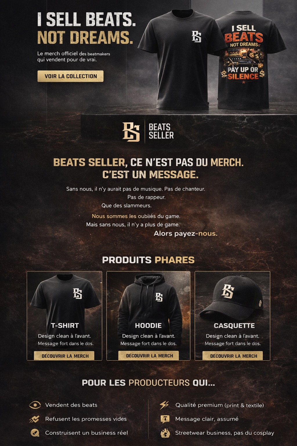 T-shirts, hoodies et casquettes Beats Seller : mindset business, respect du craft, zéro bullshit.